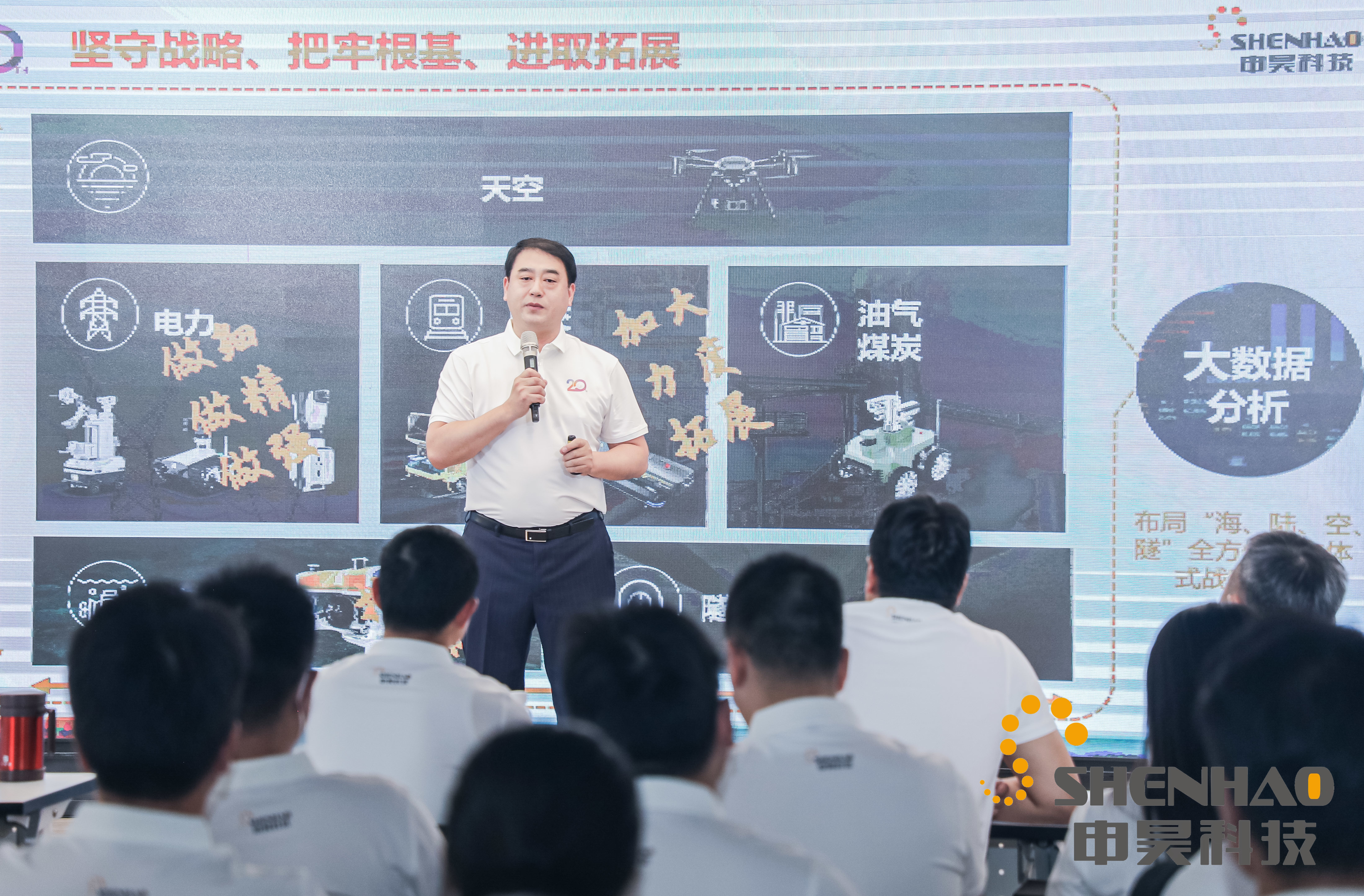 陳如申董事長發(fā)表致辭,他表示,申昊科技創(chuàng)業(yè)廿載,跟隨國家的路線,堅(jiān)守國家發(fā)展戰(zhàn)略規(guī)劃,一步一個(gè)腳印,逐步壯大,從最初的電動(dòng)車檢測,到電力固定端檢測;再到室外、室內(nèi)的電力、石油化工巡檢機(jī)器人;拓展到軌道交通領(lǐng)域的檢測線路的機(jī)器人、檢測車底的機(jī)器人、檢測剛性接觸網(wǎng)的機(jī)器人;發(fā)展至今,產(chǎn)品線正在向著企業(yè)戰(zhàn)略“海陸空隧”各個(gè)領(lǐng)域突破。產(chǎn)品線越來越豐富的同時(shí),企業(yè)規(guī)模也在不斷發(fā)展壯大。
